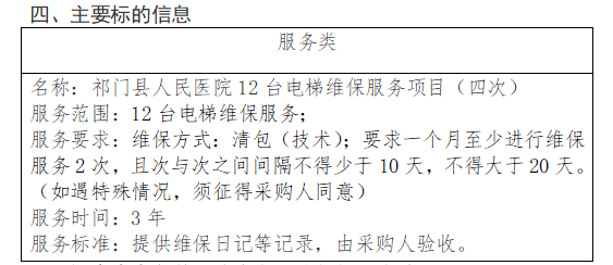 二、项目名称:祁门县人民医院12台电梯维保服务项目(四次)